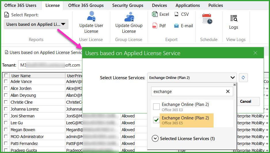 List of users who has a license to use a specific app or service (ex: Check users with Teams license, find users without Exchange Online license, and more).